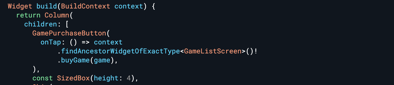 這個方式十分方便,消除了中間 Widget 的多餘參數,但是這個做法也帶來了比較明顯的缺點:子 Widget 直接依賴了目標 Widget,造成子 Widget 比較難以被重複使用。以上面的例子來說,假設今天有一個 Other 也同樣使用了 GameItemView,當 GamePurchaseButton 被按下時,由於找不到 GameListScreen,所以按鈕無法正常運作。