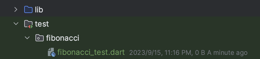 一個類別的測試通常會放在另一個獨立檔案中,在開始寫單元測試之前,我們必須先新增一個檔案,檔案名稱必須以 test 結尾 Flutter 才能辨識這個檔案是測試檔案,當我們跑全測試時,這些測試檔案才會被跑到。在專案目錄底下有一個 test 的目錄,就是讓我們放置這些測試檔案的地方,新增一個 fibonacci_test.dart,然後我們就可以開始寫測試了。